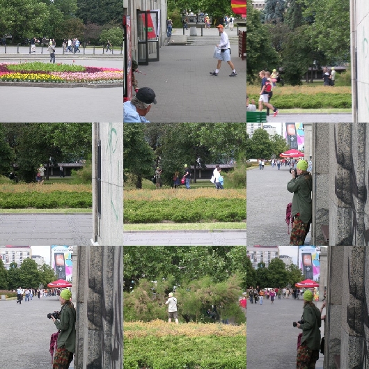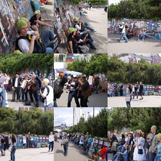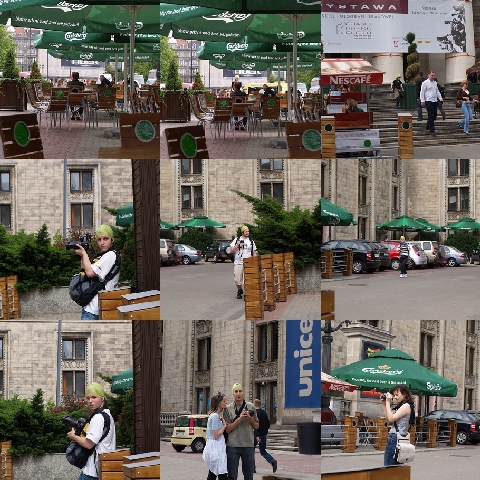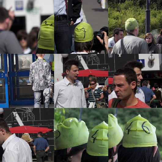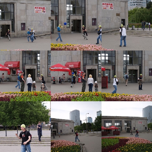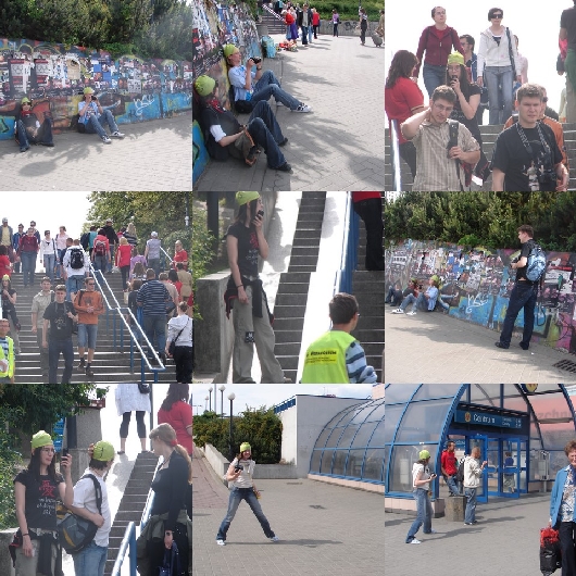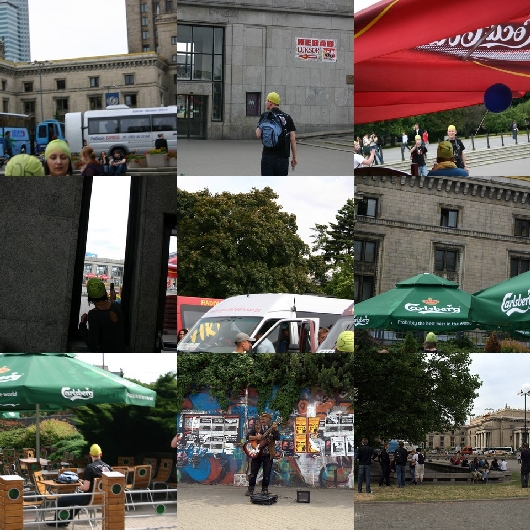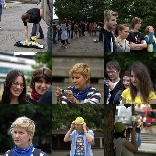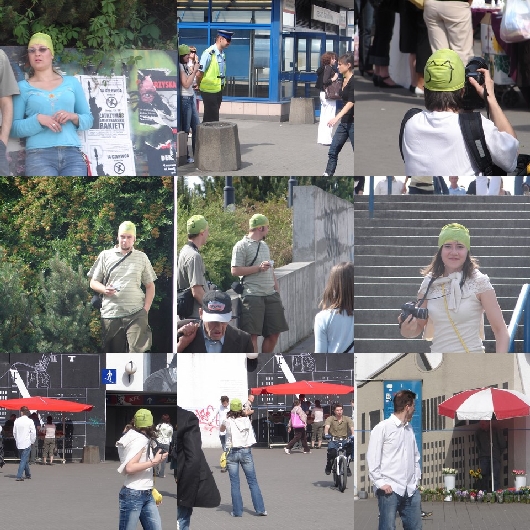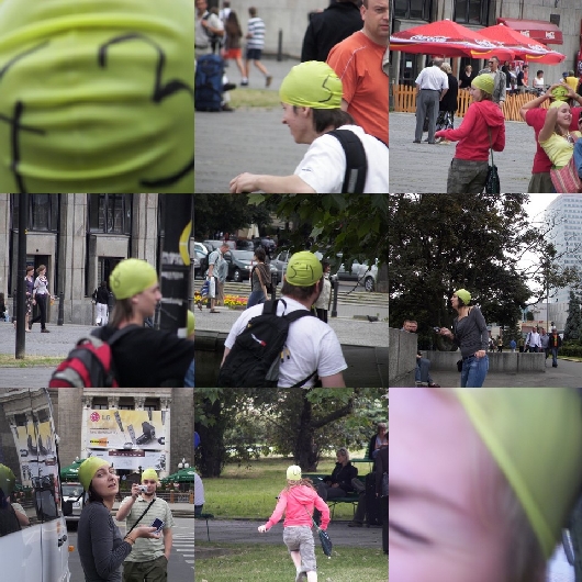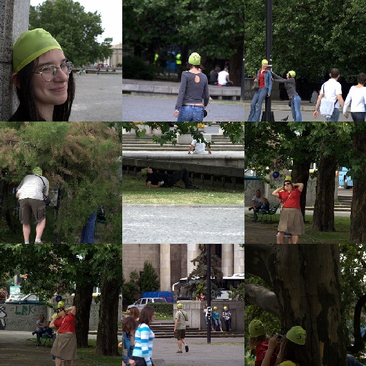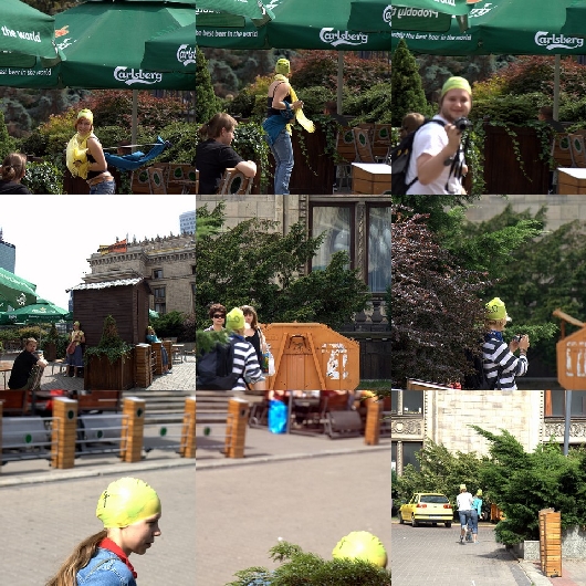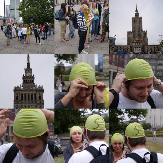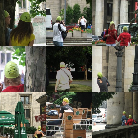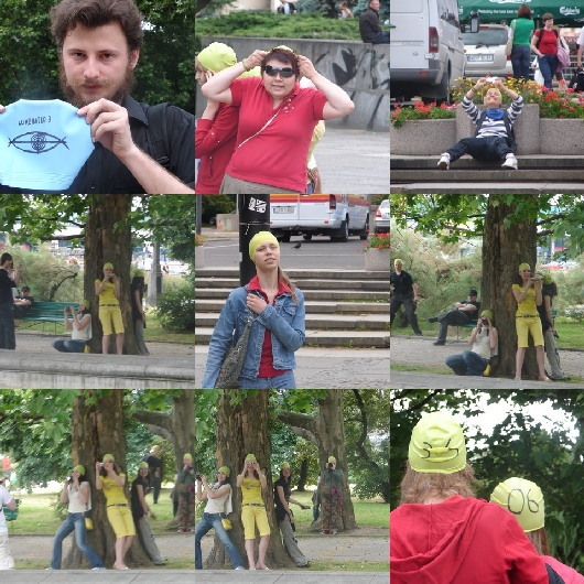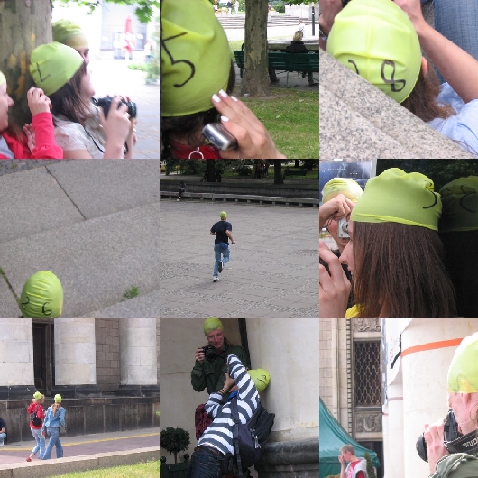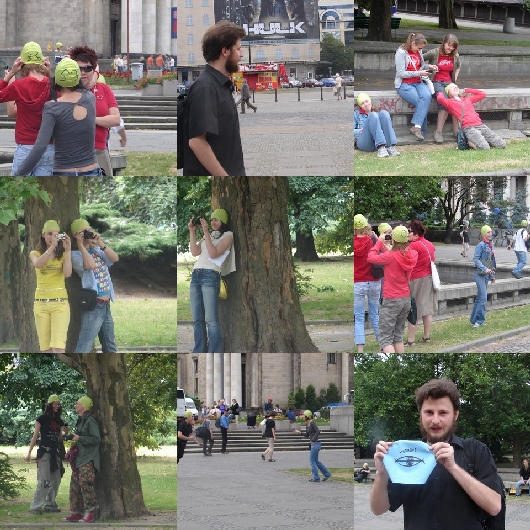 Zanim jednak przejdę do opisania tego, co wydarzyło się pośród drzew, napiszę jeszcze kilka słów o samej rozgrywce. Jak zwykle mogliśmy zobaczyć całą gamę różnych stylów gry. Część osób stała pod drzewami, inni biegali (przodem lub tyłem), jeszcze inni kryli się za betonowymi donicami, murkami, przy ścianach. Mieliśmy też przykłady współpracy pomiędzy niektórymi graczami, którzy chronili się wzajemnie, przykładając głowę do głowy, tak aby chronić swoje numery (nie muszę chyba wyjaśniać, że poruszanie się w ten sposób było nieco utrudnione). Dla miejscowych pijaczków i przypadkowych przechodniów musieliśmy wyglądać niezwykle, co zresztą można było wyczytać z ich spojrzeń i wyrazów twarzy. Grupki dziwnych postaci ukrywające się pośród drzew, uganiające się po chodniku z aparatami, albo przytulone do budynków to widok niezwykły, ale cała sytuacja wydała mi się szczególnie ciekawa w kontekście miejsca rozpoczęcia gry. Niezwykle surrealistyczny jest widok dwudziestu czterech osób w żółtych, ponumerowanych czepkach, biegających z aparatami w rękach, wokół oraz po dnie wyschniętego basenu. Swoją drogą wspomniany basen pełnił funkcję swego rodzaju okopów.