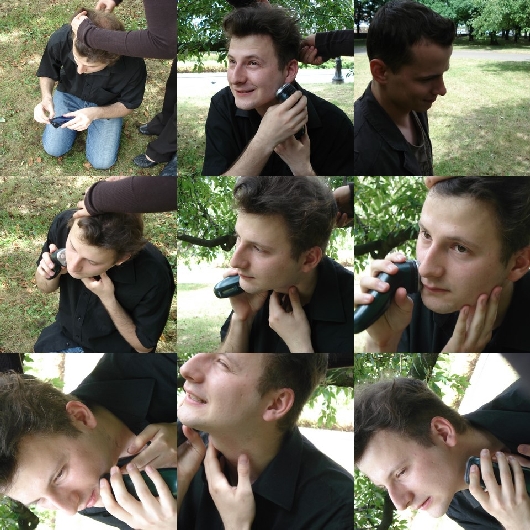 Kolejne pęczki włosów upadały na trawnik, a zarost i bujna fryzura znikały coraz bardziej. Byłem ciekaw, czy przechadzający się w okolicy mundurowi nas zauważą, i czy zechcą w jakiś sposób zainterweniować, ale na szczęście tak się nie stało. Swoją drogą jestem ciekaw, jaka byłaby ich reakcja. Golenie się w przestrzeni publicznej chyba nie jest zabronione, prawda?